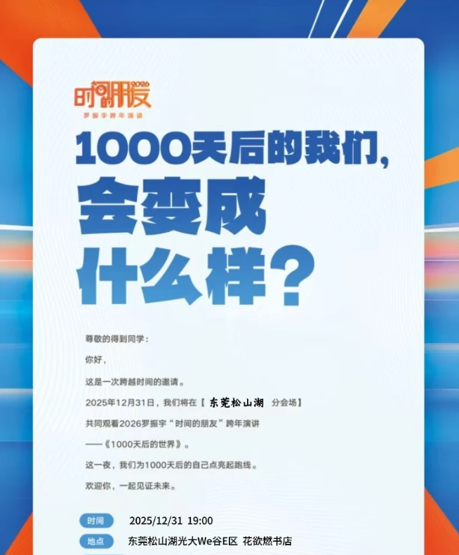 为什么值得一起看这场演讲?罗振宇“时间的朋友”跨年演讲不只是年终总结今年的主题“1000天后的世界” 更像一份 “未来生活指南”☀️他会用一整年搜集的案例和洞察,帮你:✔️捋清脉络:在变化中看清那些确定的“慢变量”✔️打开视野:发现普通人正在创造的新活法、新机会✔️获得信心:找到属于自己“脚踏实地、仰望星空”的力量一个人看是学习,一群人看是共鸣、碰撞与启发