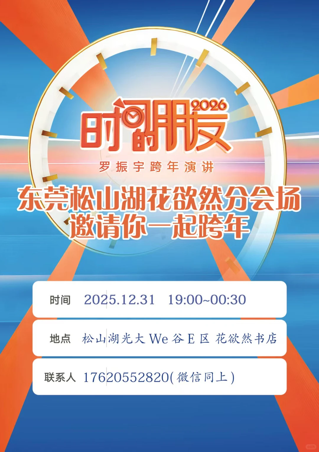 在花欲燃书店,不止“观看”,更是“感受”✔️被书墙环绕的沉浸式大屏观影✔️特调饮品+跨年糕点自由享用✔️环节设计细腻,从礼物互赠到跨年倒数✔️和同样追求成长的小伙伴,碰撞观点、轻松聊天 活动信息主题:罗振宇2026跨年演讲分会场 · 1000天后的世界⏰时间:12月31日(周三)19:00-00:30地点: